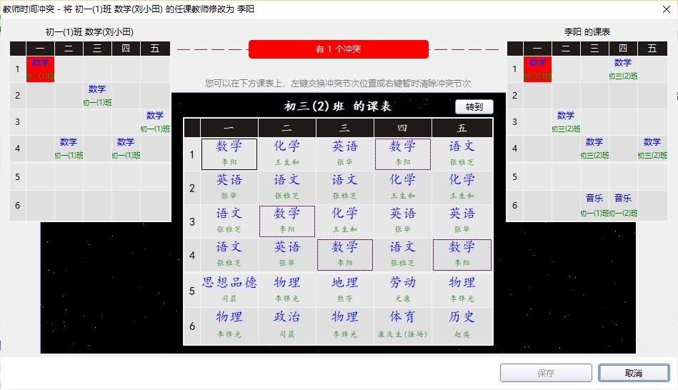 由于课表已经生成,要考虑教学计划的已排节次和新任课老师的上课时间是否存在冲突。调整任课教师工具可以帮您确认是否存在时间冲突,并提供相关解决工具。