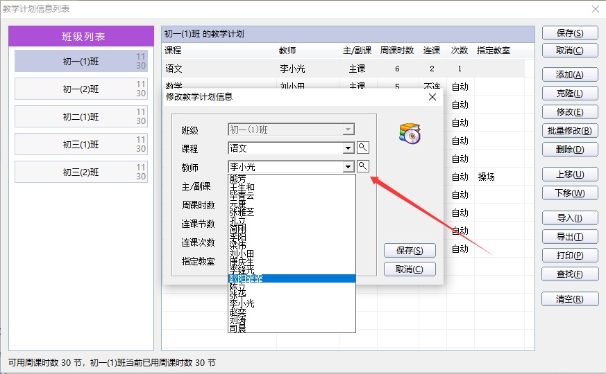 1. 如果课表未生成,不用考虑课表时间冲突,可以直接在第2页的教学计划窗口中修改教师。